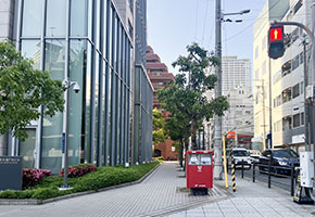 横断歩道を渡って右手の郵便ポストを超えて真っ直ぐ進んでください。