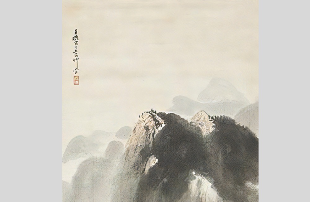 白い雲に覆われた山々は、墨彩ならではの濃淡で陰影や質感を表しています。 渓谷の中を船が静かに進む様子から、静寂な空気感が伝わり、筆触によって遠近感が見事に表現されています。