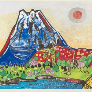 富士山を好み、多く描いた片岡球子の作品の中で、傑作といわれた画です。片岡球子の個性が余すことなく発揮され、力強い構成と色使いで描かれています。白と青の爽やかなコントラストをなす美しい富士が屹立し、片岡球子の世界観を見事に表現しています。