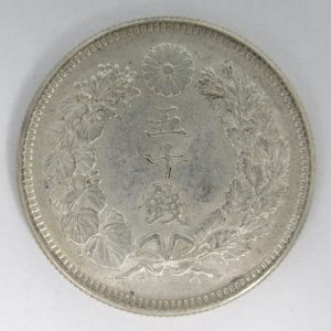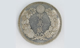 「貿易銀」は明治期に日本で発行された大型銀貨で、主に清国や東南アジアとの貿易決済用に流通しました。表面には龍、裏面には「菊の紋章」や「桐の葉」の模様が刻まれ、当時の日本の国際化を象徴する存在です。直径38mm・重量27gと迫力のあるサイズで、現在ではコレクターに高い人気があります。状態や希少性によっては非常に高額で取引される銀貨です。