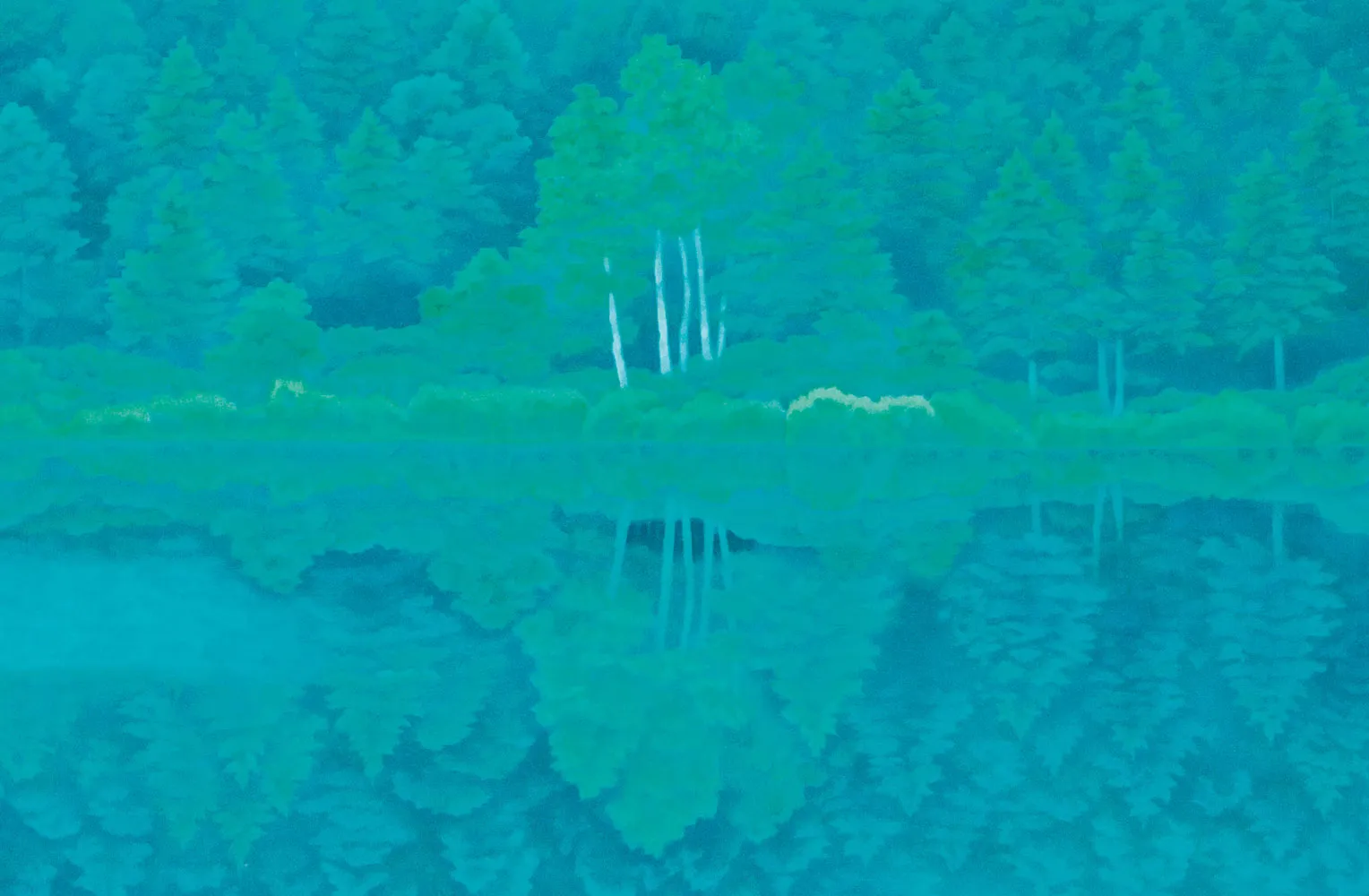 この作品でまず目を引くのは東山魁夷特有の色彩の使い方です。東山魁夷は色を非常に慎重に選び、微細な色調の変化を重視しました。緑の色合いが非常に多様で、葉や草木、そして水面に映るそれぞれの色が、光の加減や視点によって異なる表情を見せています。これはは自然を観察し、自然の微細な変化を捉えようとする東山魁夷ならではと言えます。緑色だけでなく光の反射や水面に映る色が絵に奥行きを与え、静かでありながらも豊かな表現力を感じさせます。